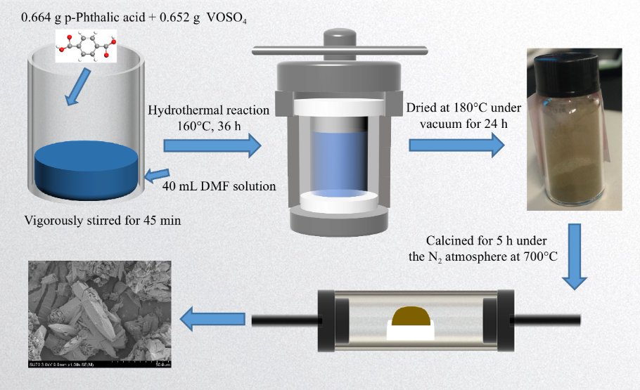 采用簡單的水熱反應(yīng)和煅燒法制備了具有子彈狀結(jié)構(gòu)的釩基MOFs材料。首先,將0.652 g硫酸釩氧化物水合物(VOSO4Alfa,純度99.9%)和0.664 g對(duì)苯二甲酸(Alfa,純度98%)溶于45 mL二甲基甲酰胺(DMFAlfa,純度99.8%)溶液中,在100 mL不銹鋼高壓釜中劇烈攪拌45分鐘。160°C保溫36 h后用甲醇洗滌8次,離心后將得到的固體在180°C真空干燥24 h,最后在700°C N2氣氛下煅燒5 h,便能得到釩基MOFs材料。