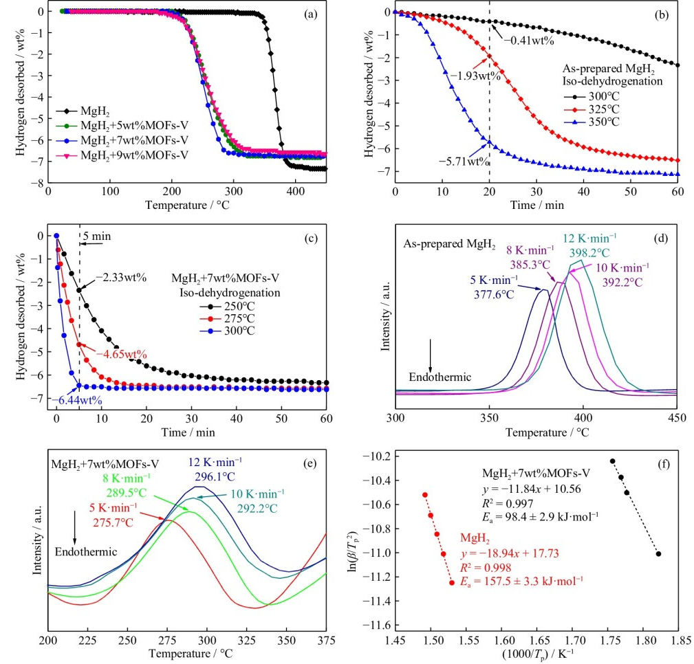 7wt% MOFs-V的加入使MgH2的初始解吸溫度由340.0降至190.6°C。在300°C條件下,MgH2+7wt%MOFs-V復(fù)合材料在5 min內(nèi)釋放了6.4wt%H2