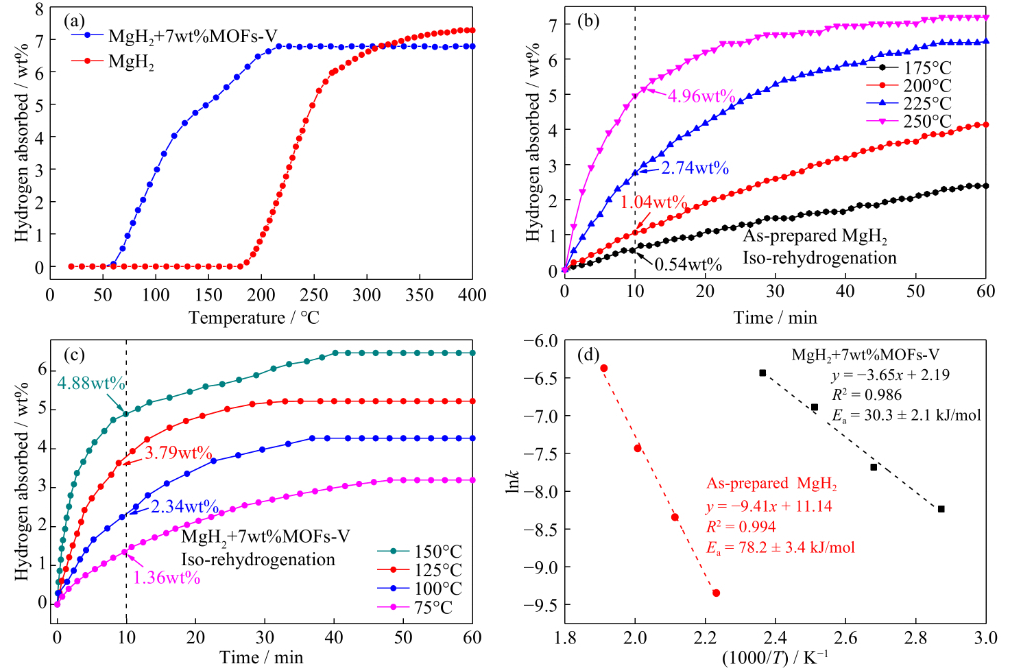3. (a) MgH2MgH2+7wt%MOFs-V復(fù)合材料在不同溫度下的吸氫曲線。(b) MgH2(c) MgH2+7wt%MOFs-V復(fù)合材料的恒溫吸氫曲線。(d) MgH2MgH2+7wt%MOFs-V復(fù)合材料的Arrhenius曲線擬合。