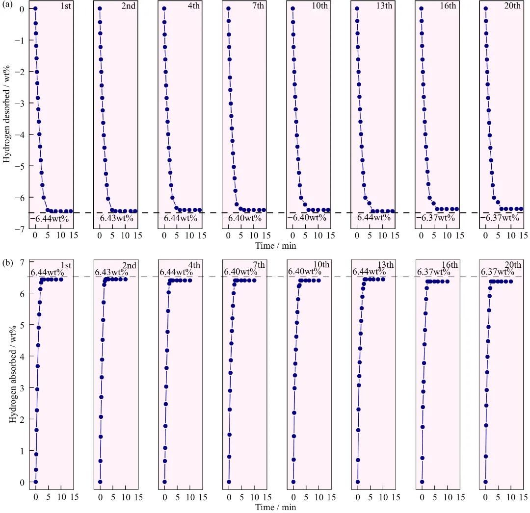4MgH2+7wt%MOFs-V復(fù)合材料在300°C下的循環(huán)曲線。復(fù)合材料在第一次循環(huán)中釋放了6.44wt%H2,在第十次脫氫實(shí)驗(yàn)中仍然釋放了6.40wt%H2。在第20個(gè)周期中,MgH2+7wt% MOFs-V復(fù)合材料解吸了6.37wt%H2,與第一次循環(huán)相比,保持了98.9%的儲(chǔ)氫榮量。