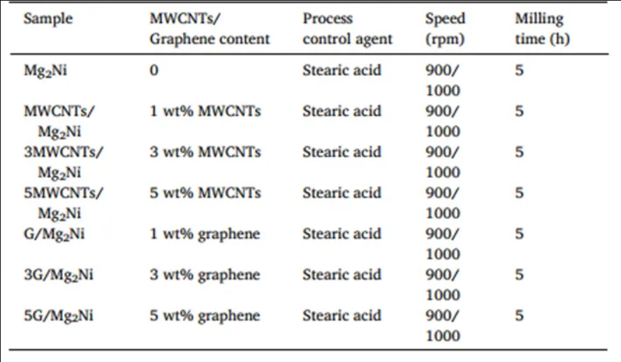 高能球磨制備Mg2Ni復(fù)合石墨烯和MWCNTs材料