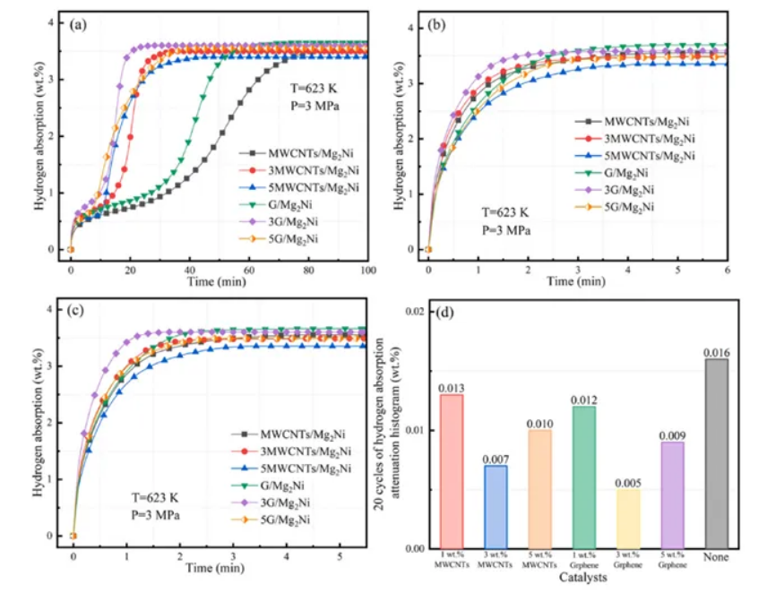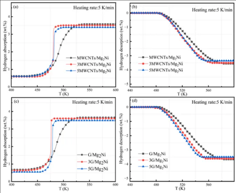 當(dāng)添加量為3wt%時表現(xiàn)出最佳的吸氫性能,在475K的溫度下,在200s內(nèi)迅速達(dá)到吸氫的飽和狀態(tài),在達(dá)到吸收溫度后表現(xiàn)出穩(wěn)健的吸氫動力學(xué)。隨著5wt%MWCNTs的引入,放氫飽和溫度為545K,放氫速率也略有上升。與MWCNTs樣品相比,3G/Mg2Ni476K左右表現(xiàn)出更冷的吸氫量,具有更強(qiáng)的動力學(xué)特性,可以在150s內(nèi)快速達(dá)到吸氫飽和。