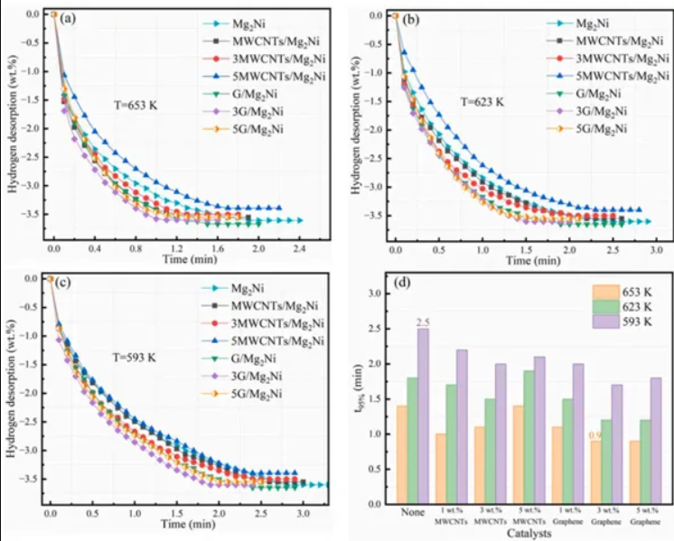 圖6 不同添加量的MWCNTs和石墨烯復(fù)合材料在不同溫度下的放氫動力學(xué)曲線:(a)653K;(b)623K;(c)593K;以及(d)達(dá)到最大放氫量95%所需時間的柱狀圖