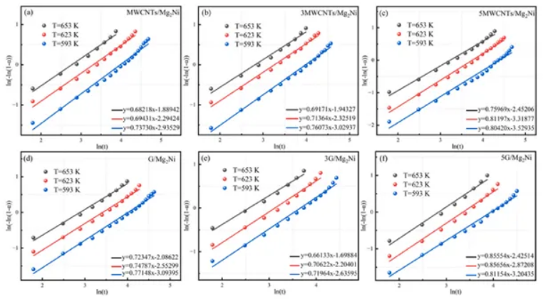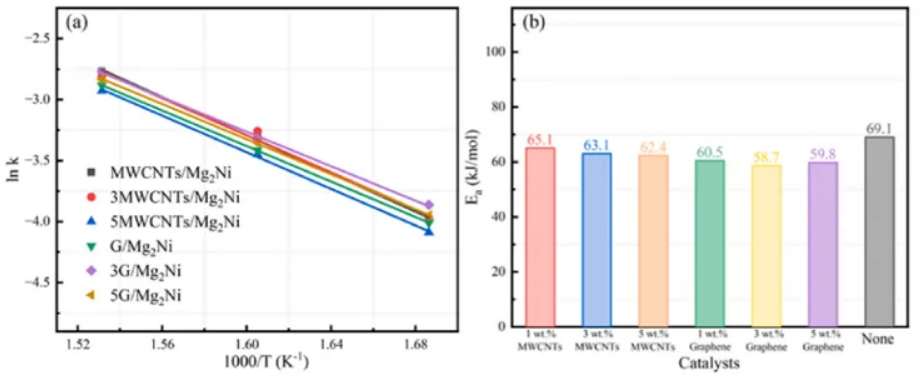 MWCNTs和石墨烯的結(jié)合有效地降低了Mg2Ni合金放氫反應(yīng)所需的活化能,從而提高了放氫動力學(xué)效率。特別值得注意的是,在3wt%石墨烯復(fù)合材料中,激活能最低為58.7kJ/mol,與Mg2Ni合金相比降低了約10kJ/mol。這突出了合金放氫動力學(xué)最有效的增強(qiáng)。